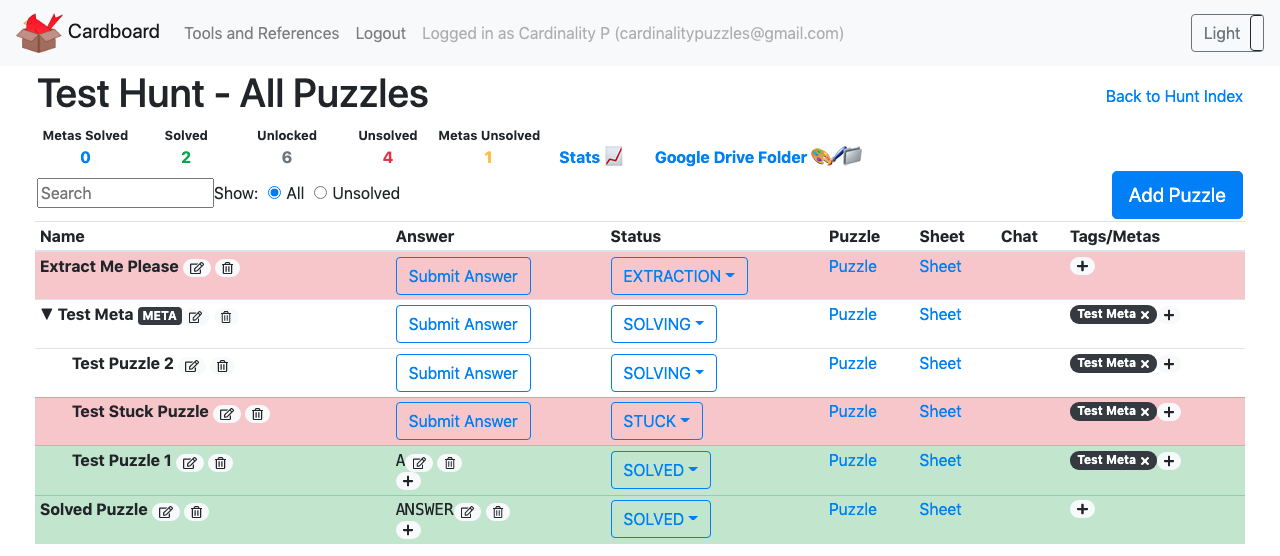 A dashboard for managing puzzles and tracking status during a puzzle hunt, such as MIT Mystery Hunt: